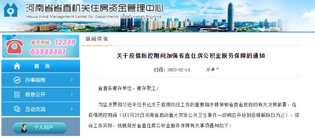 2月13日,河南省直机关住房资金管理中心发布关于疫情防控期间加强省直住房公积金服务保障的通知,通知称,受疫情影响导致生产经营困难的企业,不能按月缴存住房公积金的,可按规定申请暂缓缴存住房公积金或降低缴存比例,最低可降至国家规定的5%。待企业效益好转后,再补缴公积金或恢复缴存比例。