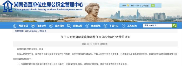 2月14日湖南省直单位住房公积金管理中心发布关于应对新冠肺炎疫情调整住房公积金部分政策的通知,包含受疫情影响近期未能及时缴存住房公积金的单位,说明情况并补缴后,可视同正常缴存,其职工申请贷款权益不受影响等内容。