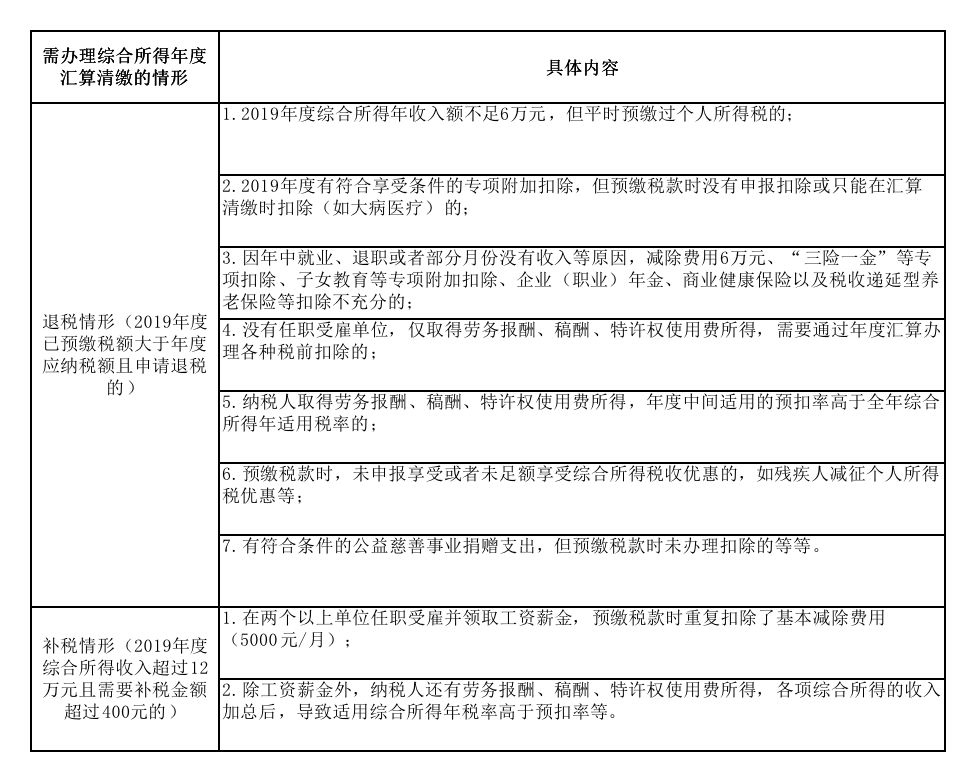 所谓的综合所得汇算清缴主要是由于新个人所得税法首次建立了综合与分类相结合的个人所得税制。“综合税制”下,居民个人需要“合并全年综合所得,按年计算税款,办理年度汇算”。需要办理个税综合所得汇算清缴的个人无外乎两种情况,一是需要退税,二是需要补税。实践中有一些比较典型的情形,将产生或者可能产生退补税,主要如下: